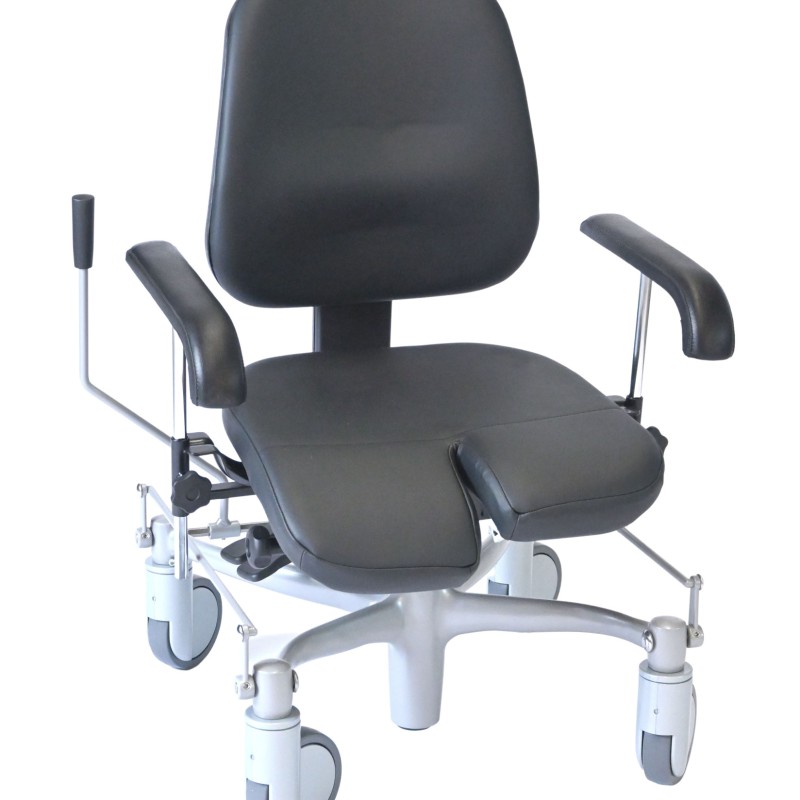 Das Besondere an diesem Stuhl ist der dreigeteilte Sitz: Die beiden vorderen Sitzhälften sind stufenlos und unabhängig voneinander neigbar und feststellbar. Der hintere Teil lässt sich ebenfalls stufenlos neigen. Auch der ergonomisch geformte Rücken ist neigbar und kann in der Höhe angepasst werden.Sicheres Hinsetzen und Aufstehen