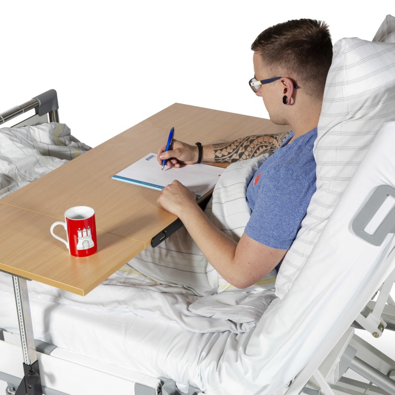 As the name suggests, the Bridge Bed table is primarily designed for bedridden patients. It can be rolled over the bed from the foot end or positioned close to the patient at the bedside. When not in use, the table can easily be pushed aside. For this purpose, the table is equipped with four sturdy, lockable casters. Besides serving as a bed table, it can also be used as a side table for meals while sitting in an armchair or on the sofa, or as a height-adjustable work table.