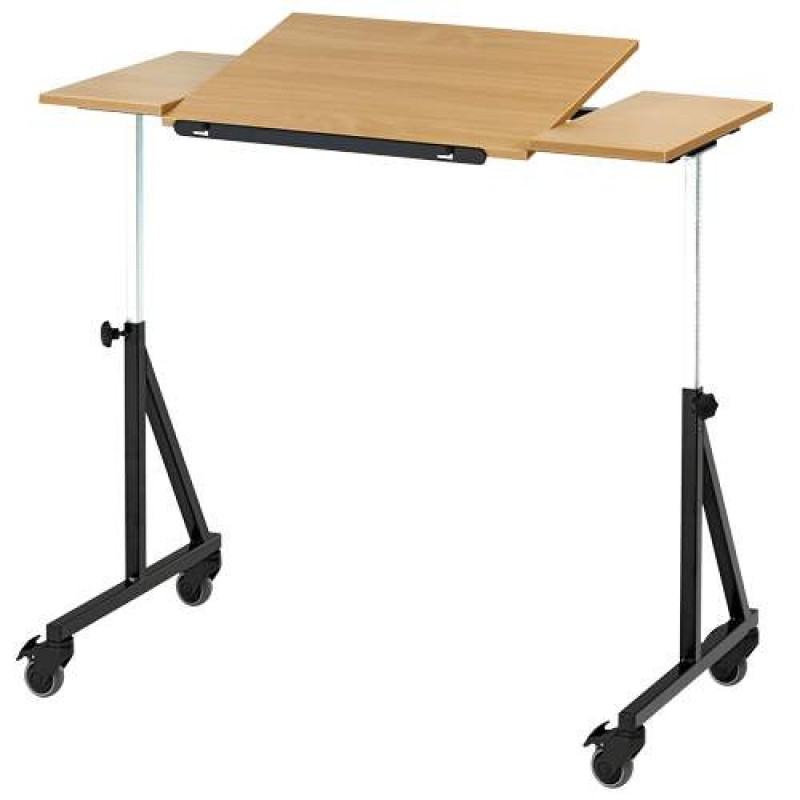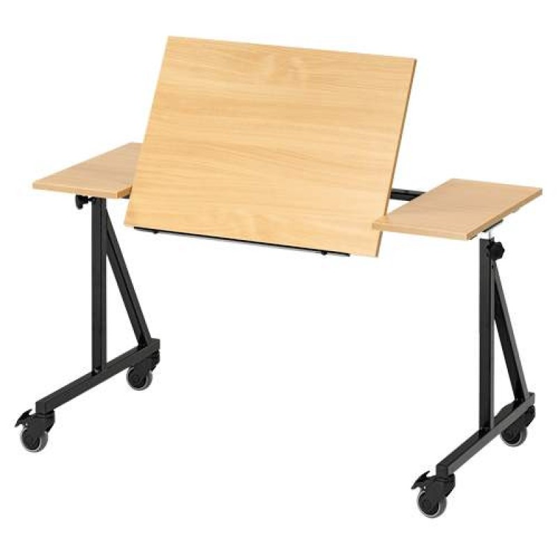 - Three-part tabletop: total tabletop 120 x 50 cm, middle panel 70 x 50 cm, left and right storage surfaces 25 x 50 cm, middle section tiltable up to 60°, square edges