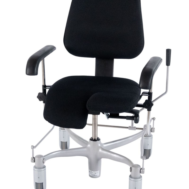 Das Besondere an diesem Stuhl ist der dreigeteilte Sitz: Die beiden vorderen Sitzhälften sind stufenlos und unabhängig voneinander neigbar und feststellbar. Der hintere Teil lässt sich ebenfalls stufenlos neigen. Auch der ergonomisch geformte Rücken ist neigbar und kann in der Höhe angepasst werden.Sicheres Hinsetzen und Aufstehen