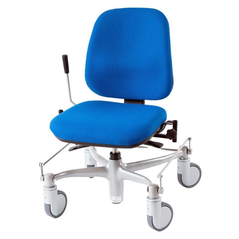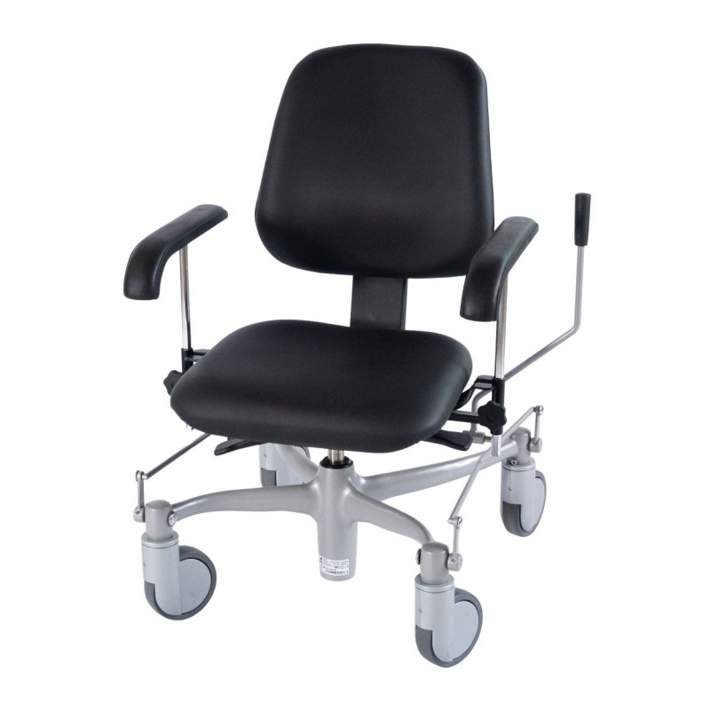 Für sicheres Hinsetzen und Aufstehen sorgen die Zentralbremse und die verdrehfeste Gasdruckfeder. Die Zentralbremse stoppt bzw. löst alle vier Rollen gleichzeitig. Der Hebel zum Betätigen der Bremse kann auf Wunsch links oder rechts am Gestell montiert und vom Nutzer selbst oder einer anderen Person betätigt werden. Damit seitliche Drehbewegungen vermieden werden, ist die Gasdruckfeder für die Höhenverstellung des Sitzes verdrehfest.